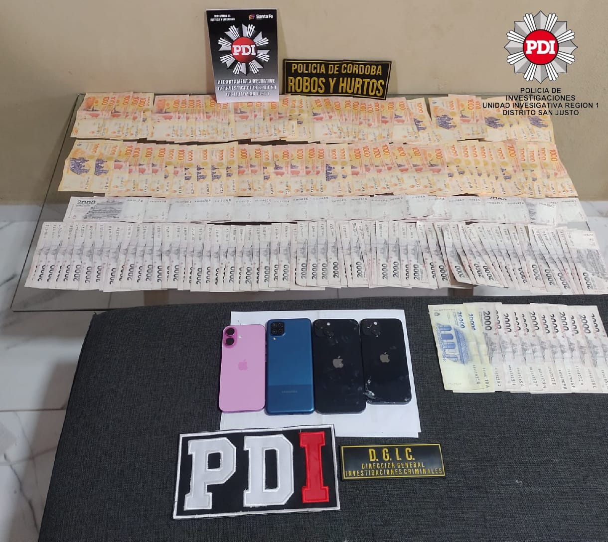 Este jueves, personal de PDI San Justo, en forma conjunta con fuerzas de seguridad de la provincia de Córdoba, llevó adelante las medidas judiciales y secuestró el auto Peugeot 208, cuatro teléfonos celulares, $325.000 en efectivo y una pistola marca BERSA calibre .22 con dos cargadores municionados.